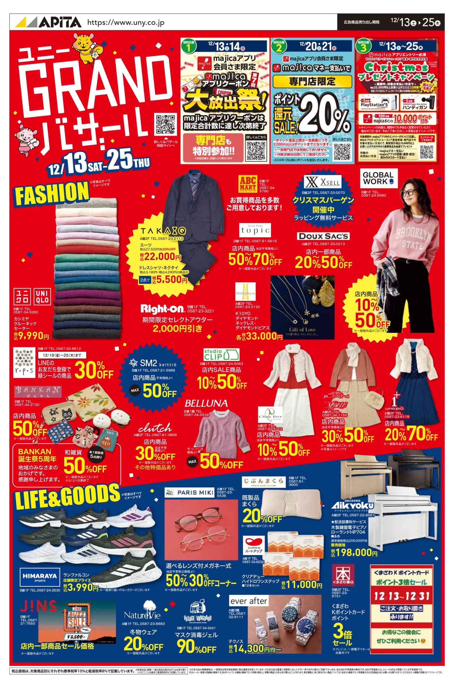2025.12.13更新 【12/13(土)〜12/25(木)】GRANDバザール開催! 期間 12/13(土)〜12/25(木) 時間 各日終日 大きい画像はこちら[PDF:6.5MB] 詳しくはこちら→https://www.uny.co.jp/sp/bazaar/
